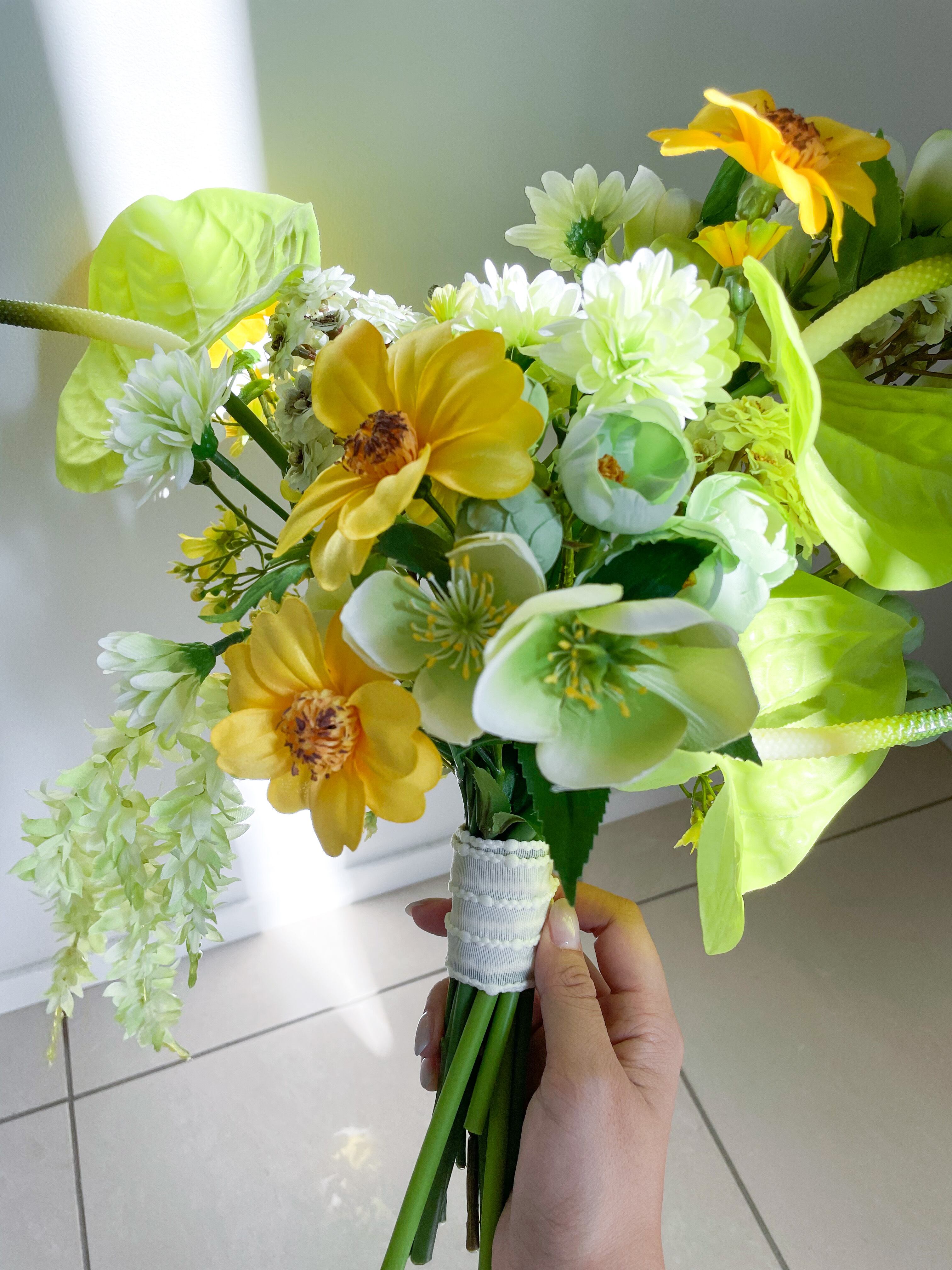 みずみずしいグリーンのアンスリウムとパキッとしたイエローのマリーゴールドで束ねた韓国ブーケ。